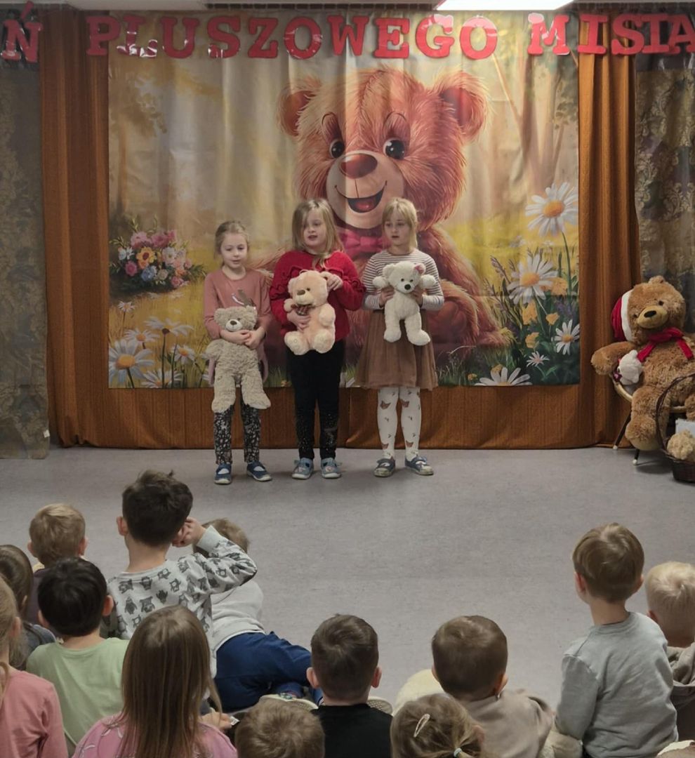 W dniu 25 listopada w naszym przedszkolu obchodziliśmy jedno z najbardziej lubianych przez dzieci świąt – Święto Pluszowego Misia. To wyjątkowy dzień, w którym najmłodsi mogą świętować razem ze swoimi ukochanymi, miękkimi przyjaciółmi, a przedszkole wypełnia się uśmiechem, radością i… mnóstwem misiów w każdym kolorze i rozmiarze. Od samego rana w salach panowała wyjątkowa atmosfera. Dzieci z dumą prezentowały swoje pluszaki – niektóre były malutkie i zmieściły się w kieszeni, inne ogromne, takie, które ledwo mieściły się w drzwiach. Każdy miś miał swoją historię, imię i wyjątkowe miejsce w sercu właściciela.Następnie przedszkolaki wzięły udział we wspólnej uroczystości na której były zabawy ruchowe ,,misiowe”konkursy oraz wspólne tańce z pluszakami. Dzieci wysłuchały także opowieści o tym, skąd wzięła się tradycja tworzenia pluszowych misiów oraz dlaczego są one symbolem przyjaźni i bezpieczeństwa. Nie zabrakło również prac plastycznych, podczas których dzieci tworzyły portrety swoich misiów, wyklejały je, malowały i ozdabiały według własnego pomysłu. Efekty tych działań można podziwiać na przedszkolnej wystawie, która stała się prawdziwą galerią misiowych dzieł sztuki.