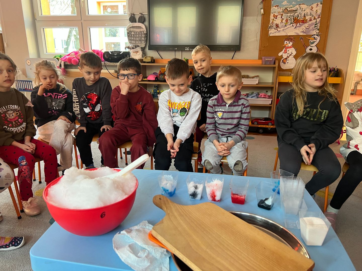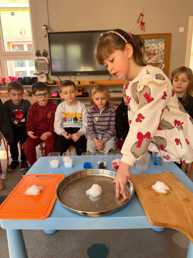 W dniu 21.01.2026 r. dzieci z grupy sześciolatków uczestniczyły w zajęciach badawczych poświęconych śniegowi. Podczas zajęć przedszkolaki obserwowały śnieg, badały jego wygląd, temperaturę oraz strukturę. Dzieci dotykały śniegu, opisywały swoje wrażenia i formułowały pierwsze wnioski dotyczące jego właściwości. Następnie przeprowadziliśmy doświadczenie polegające na pozostawieniu śniegu w sali i obserwowaniu procesu jego topnienia. Sześciolatki z dużym zainteresowaniem śledziły zmiany zachodzące w śniegu, zauważyły, że pod wpływem ciepła zamienia się on w wodę. Zajęcia wzbogaciły wiedzę dzieci na temat zjawisk przyrodniczych, rozwijały ciekawość poznawczą oraz umiejętność obserwowania i wyciągania wniosków. Doświadczenie dostarczyło dzieciom wiele radości i było okazją do nauki poprzez bezpośrednie działanie i zabawę. (E.P)