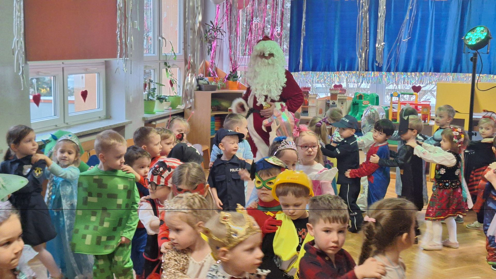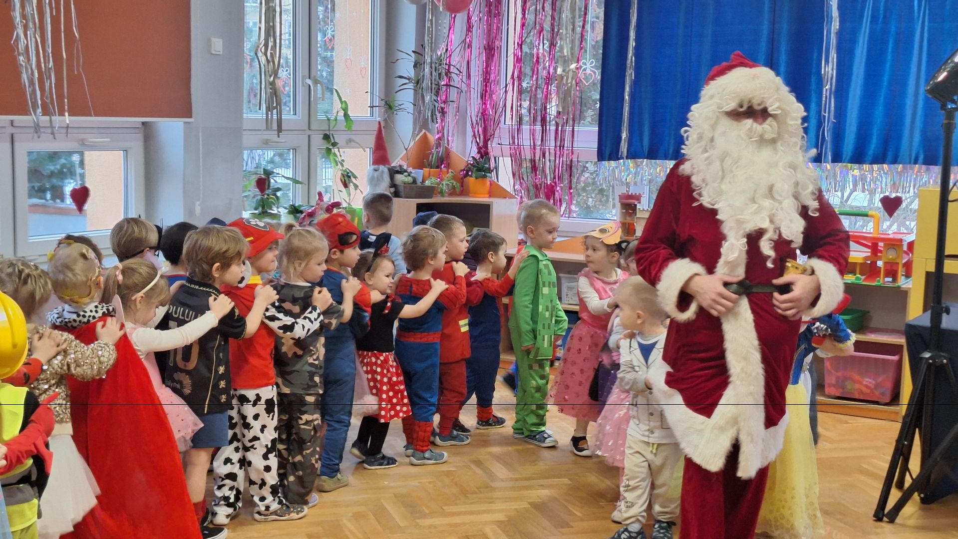 Karnawał to czas radości i rozrywki. Zarówno mali, jak i duzi czekają aby móc się bawić! Świetną ku temu okazją jest, niewątpliwie, bal choinkowy, który w naszym przedszkolu odbył się właśnie dziś. Z wielką niecierpliwością czekały na niego szczególnie dzieci, które przy pomocy rodziców oraz ich ogromnej pomysłowości przygotowały ciekawe kostiumy karnawałowe. Wśród przedszkolaków powodzeniem cieszył się szczególnie kostium Elzy i Anny bohaterek bajki „Kraina lodu”, ale nie zabrakło też odważnego strażaka, żabki, motylka, dinozaura, wróżki, biedronki, pszczółki itp. Każde dziecko miało możliwość pozowania do indywidualnego zdjęcia. Wystrój sali natomiast wprowadzał w radosny nastrój wszystkich uczestników balu oraz zachęcał do wesołej zabawy. Miłą niespodzianką dla dzieci okazały się kolorowe balony oraz zwisające serpentyny. Maluchy świetnie bawiły się w rytmach wesołej muzyki. Chętnie też brały udział w zabawach prowadzonych przez aktorów z Teatru Karuzela. Na sali podczas pląsów było bardzo kolorowo, a uśmiech na twarzach dzieci nie znikał mimo chwilowego zmęczenia. Dużym zaskoczeniem dla przedszkolaków była wizyta Mikołaja. Każde dziecko tego dnia otrzymało prezent. Kiedy czas zabawy dobiegł końca dzieci z żalem opuszczały „salę balową”.