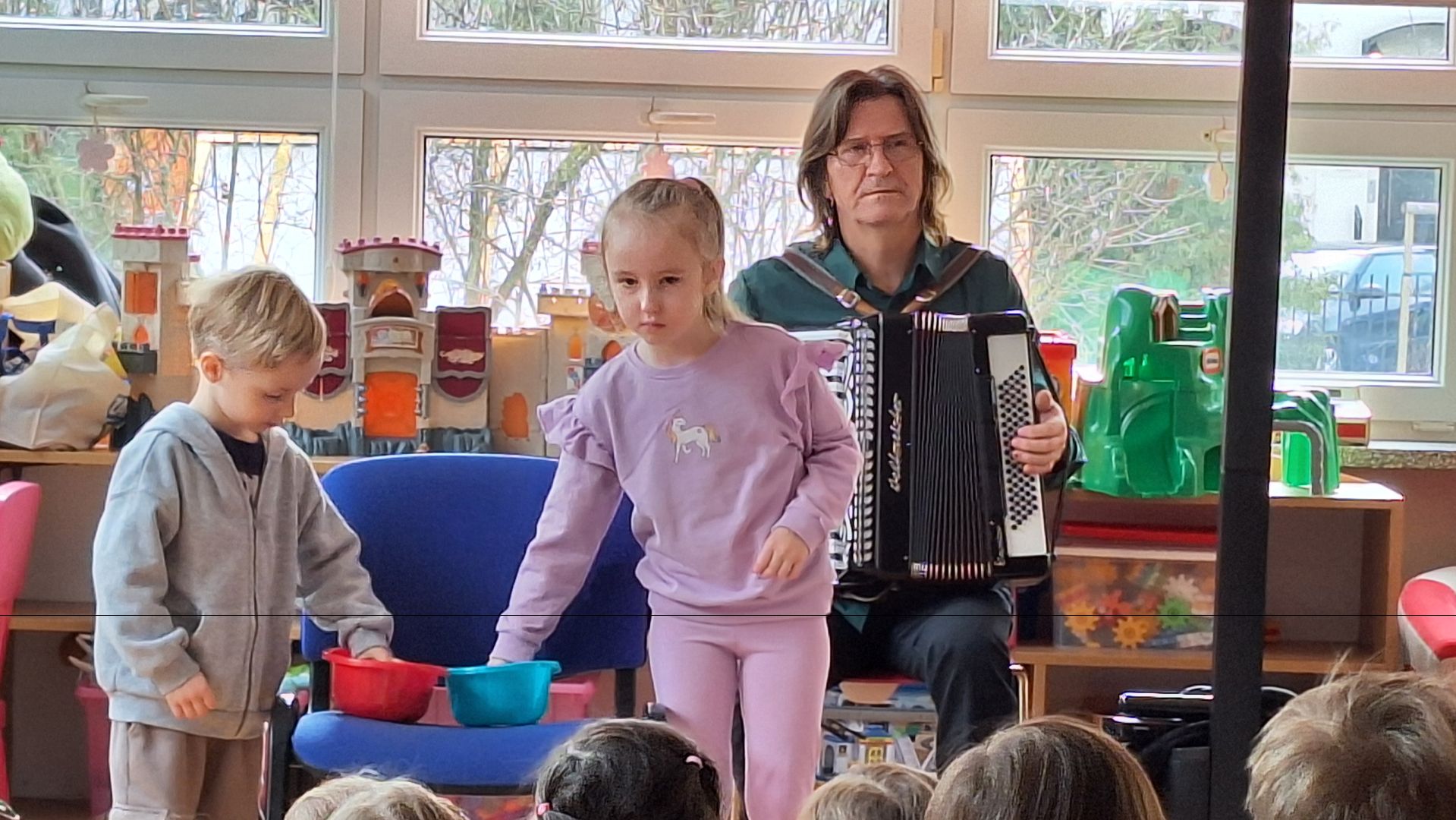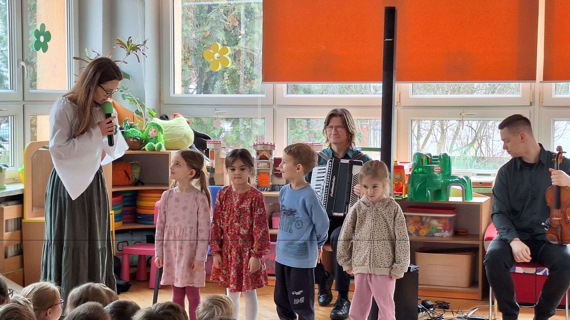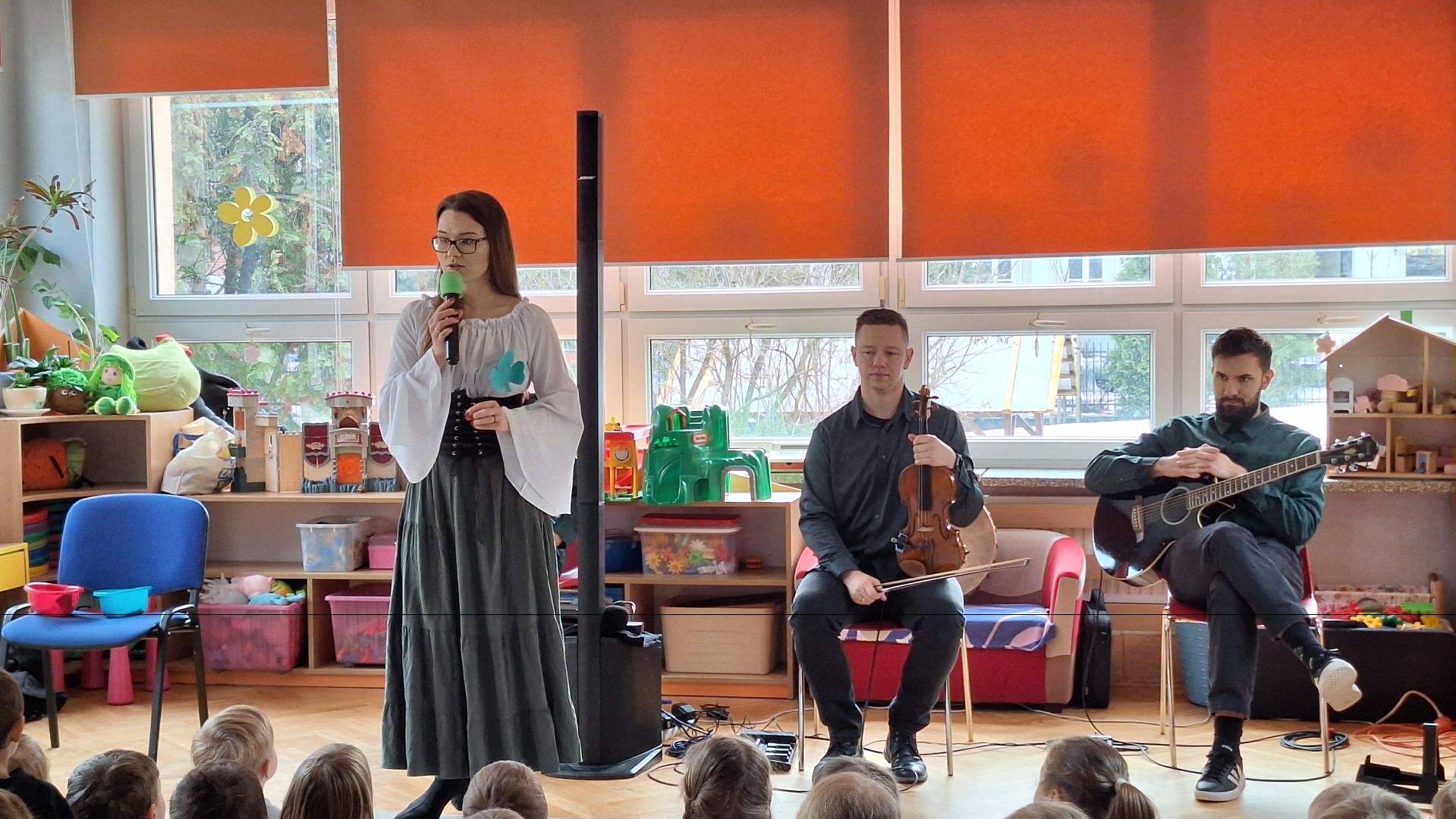 Dziś w naszym przedszkolu odbyła się audycja muzyczna pt. "Na Zielonej Wyspie". Przedszkolaki razem z muzykami z Arte Muza wyruszyły w podróż po zielonej wyspie - Irlandii. Była to doskonałą okazja, by zapoznać się z piękną muzyką irlandzką oraz z niektórymi zwyczajami tam panującymi. Do wspólnej podróży dzieci zabrała Brenda- wesoła Irlandka, która niezbyt dobrze mówi po polsku. Przedszkolaki aktywnie uczestniczyły w audycji - tańcząc, piorąc skarpetki w rytm muzyki i wspólnie śpiewając piosenki. (BK)