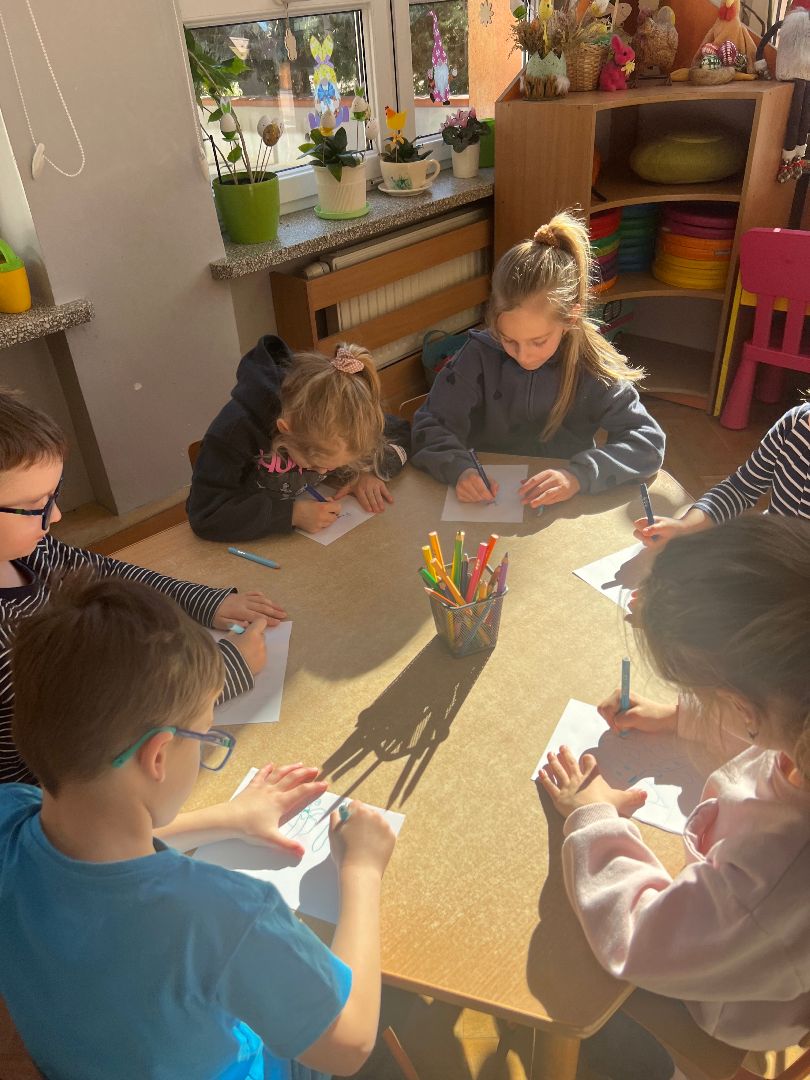 Dzieci pracują przy stoliku. Dzieci pracują przy stoliku. Dzieci pracują przy stoliku. Zdjęcie grupowe najstarszej grupy.