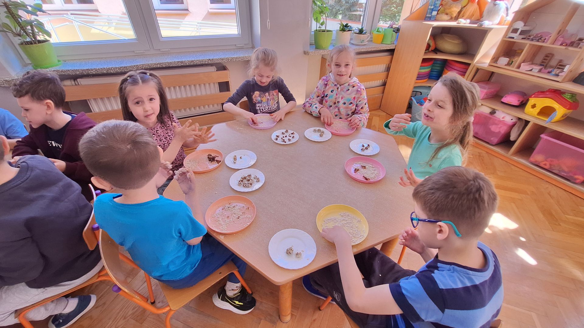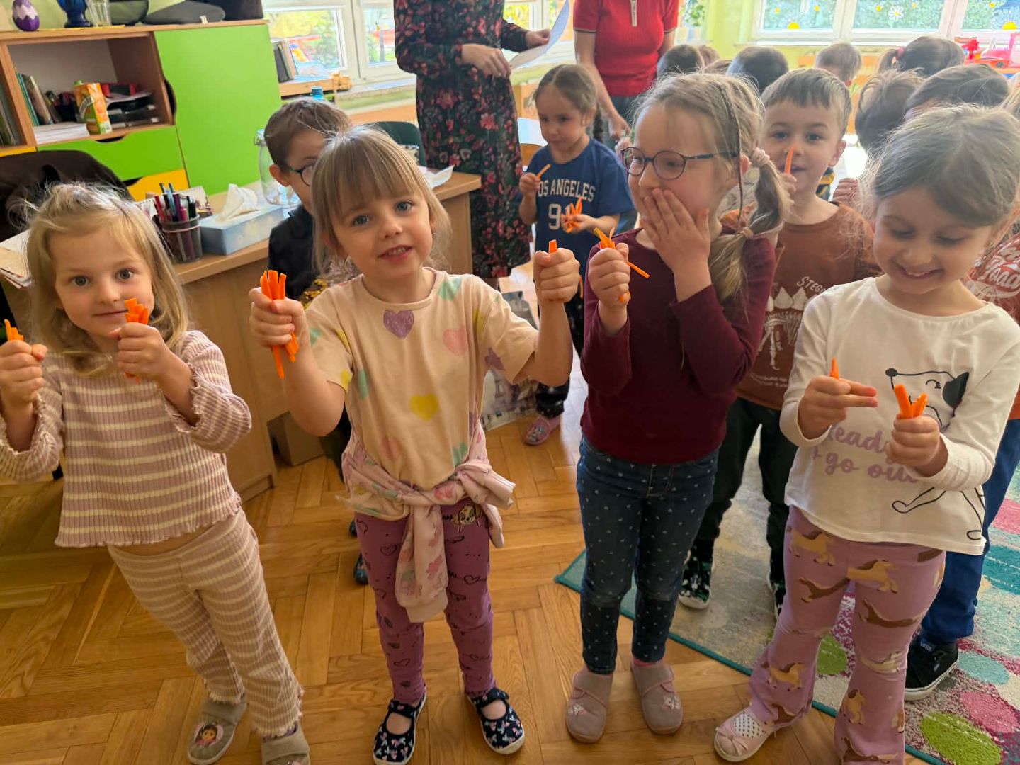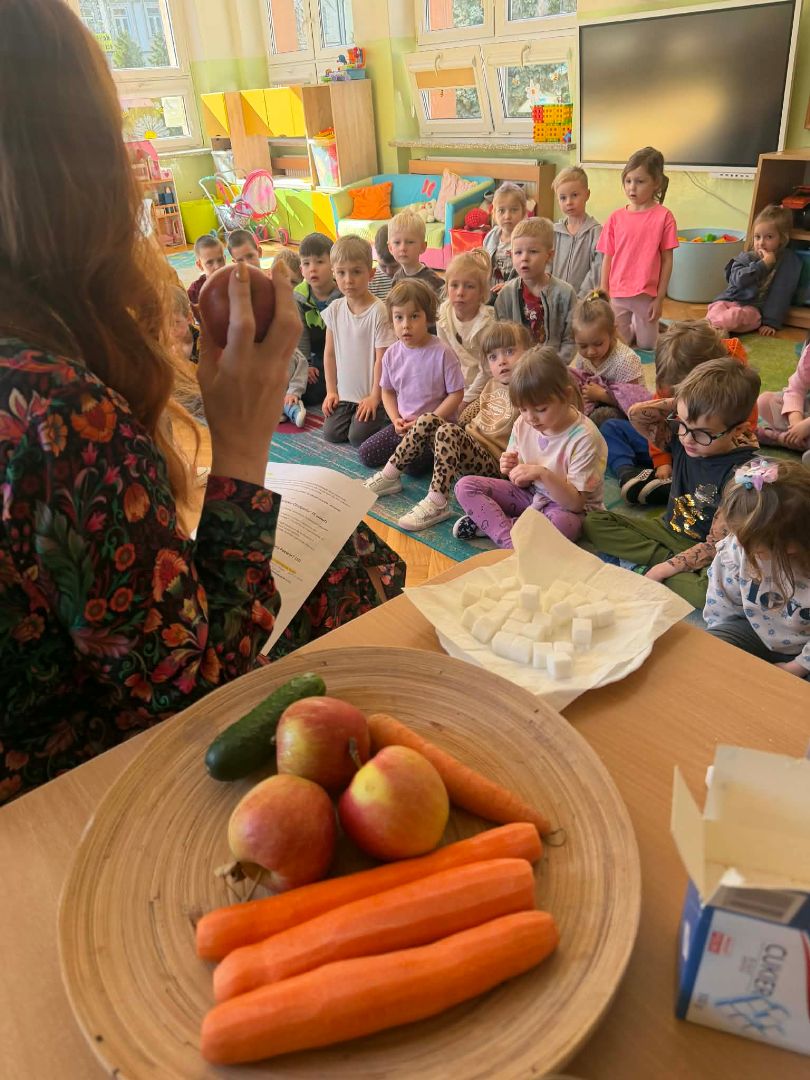 Pani Aneta Gmińska, trenerka zdrowia i ekspert żywienia i suplementacji odwiedziła nasze przedszkole by wraz z przedszkolakami rozprawić się z nadmiarem cukru spożywanym przez dzieci. W zabawy i przystępny sposób przedstawiła dzieciom cukier jako "tanie paliwo", które daje nagły skok energii, po którym dość szybko następuje gwałtowny spadek - czyli rozdrażnienie, brak skupienia i tzw. "mgła mózgowa". Pokazała ile cukru znajduje się w zwykłym soczku czy owocowym jogurcie oraz jak zamienić "cukrowego pstonika" w "paliwo mocy" czyli alternatywne zamienniki cukru np. zamiast ciastek - garść orzechów a zamiast soków i napojów w kartonikach - wodę z miętą, plasterkiem ogórka czy cytryny. Dzieci z zapałem chrupały jabłka, marchewkę i plasterki ogórka jako zdrowe przekąski a starsze przedszkolaki samodzielnie przygotowały zdrowy deser - kulki mocy.