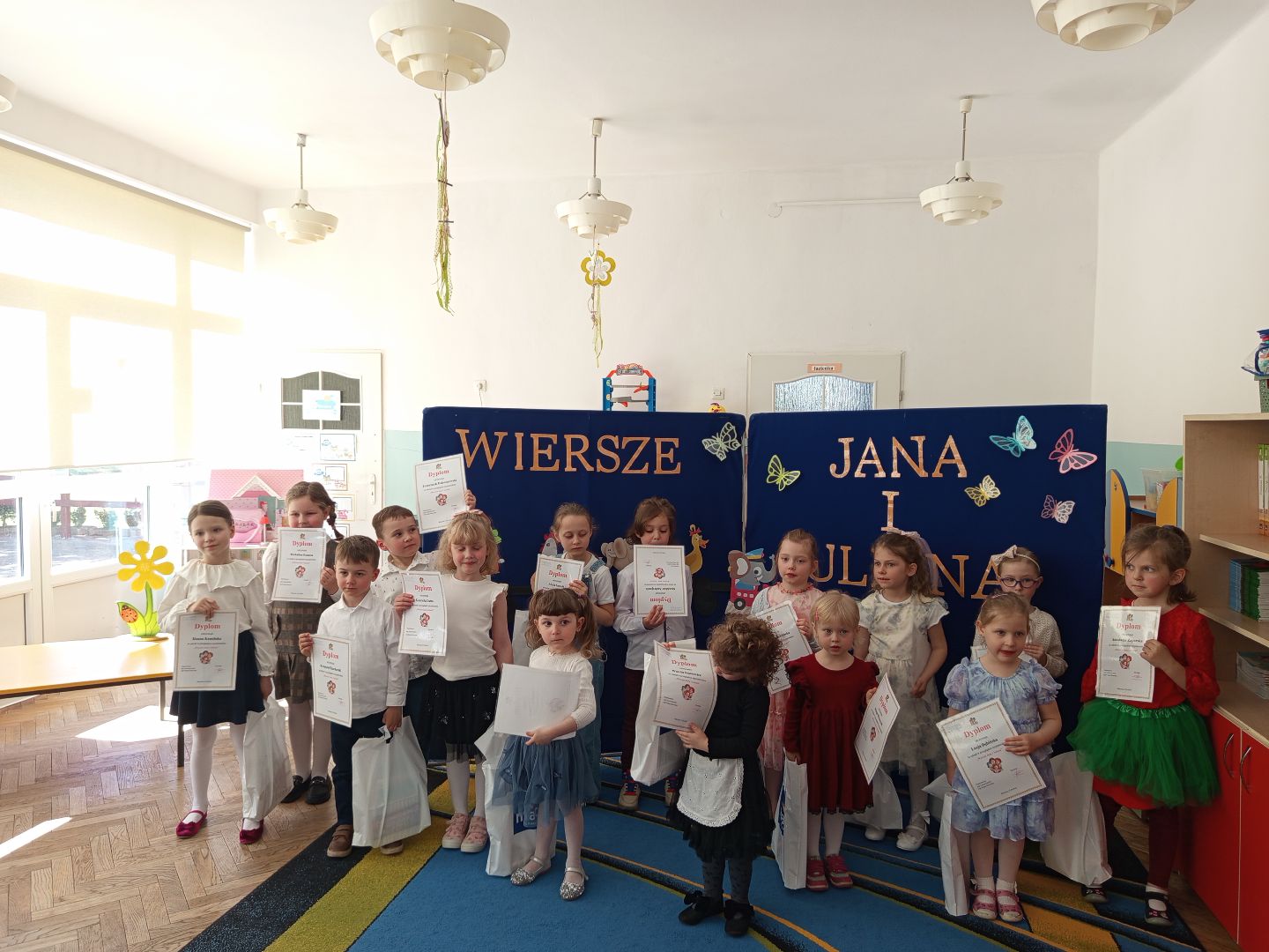 27 kwietnia Krzyś z grupy III Wiewiórki uczestniczył w Konkursie recytatorskim pt."Wiersze Jana i Juliana" w PS Nr 46. Wystąpił z recytacja wiersza Juliana Tuwima pt." Okulary". Gratulujemy. (A.SZ.)