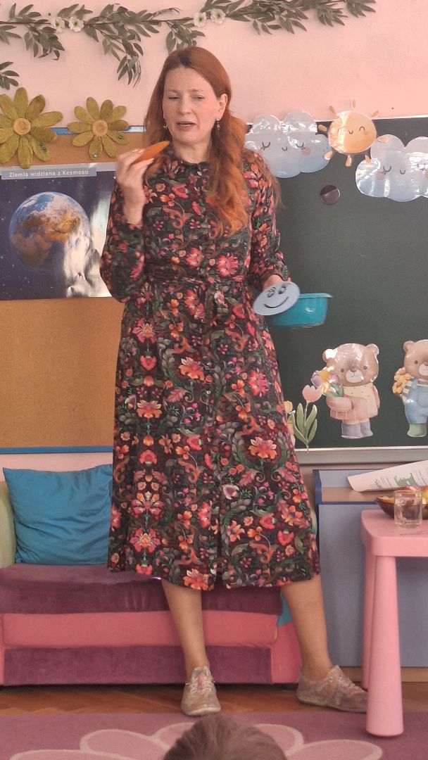 Pani Aneta Gmińska, trenerka zdrowia i ekspert żywienia i suplementacji odwiedziła nasze przedszkole by wraz z przedszkolakami rozprawić się z nadmiarem cukru spożywanym przez dzieci. W zabawy i przystępny sposób przedstawiła dzieciom cukier jako „tanie paliwo”, które daje nagły skok energii, po którym dość szybko następuje gwałtowny spadek - czyli rozdrażnienie, brak skupienia i tzw. „mgła mózgowa”. Pokazała ile cukru znajduje się w zwykłym soczku czy owocowym jogurcie oraz jak zamienić „cukrowego pstonika” w „paliwo mocy” czyli alternatywne zamienniki cukru np. zamiast ciastek - garść orzechów a zamiast soków i napojów w kartonikach - wodę z miętą, plasterkiem ogórka czy cytryny. Dzieci z zapałem chrupały jabłka, marchewkę i plasterki ogórka jako zdrowe przekąski a starsze przedszkolaki samodzielnie przygotowały zdrowy deser - kulki mocy.