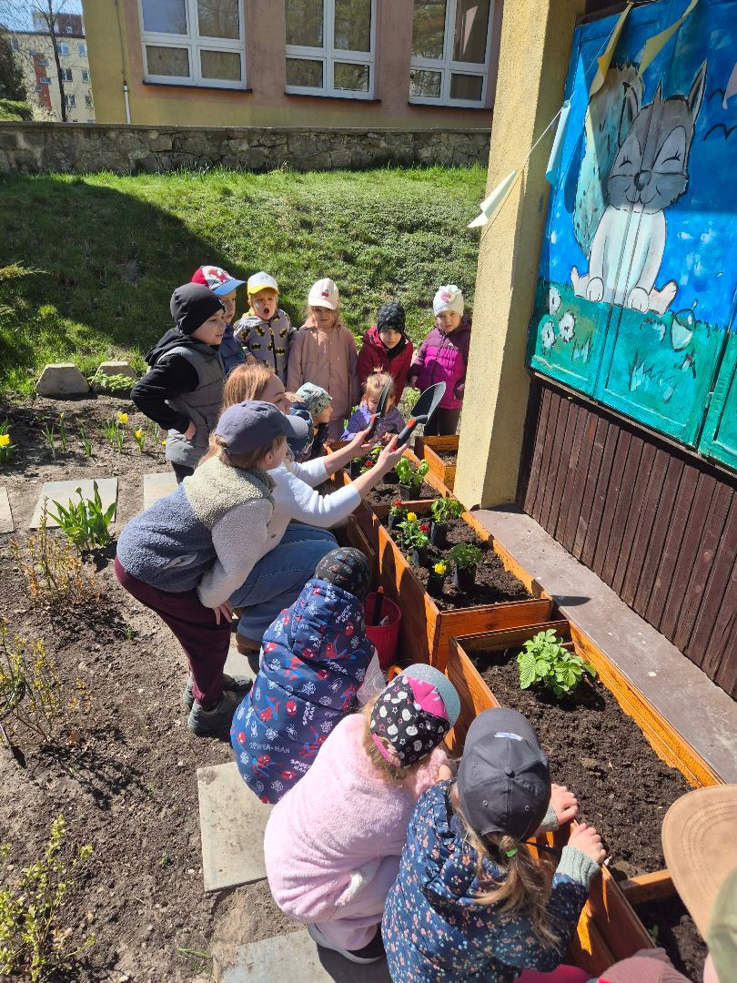 Dzisiaj grupa Liski na zajęciach dodatkowych w ramach kompetencji Zdrowy Rozwój posadziła w przedszkolnym ogrodzie roślinki: pomidorki, bazylię i aksamitki. Dzieci dowiedziały się, jak dbać o roślinki, co jest potrzebne do pracy w ogrodzie. Jako ciekawostkę Pani Ula opowiedziała dzieciom, że zapach aksamitek odstrasza owady, które atakują pomidorki i dlatego sadzi się te dwie rośliny razem. Grupa będzie regularnie teraz dbać i doglądać swojego ogródka.