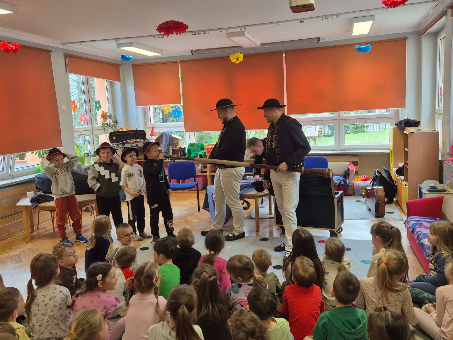 Dziś w naszym przedszkolu gościli wyjątkowi artyści – Kapela Beskidzcy Zbóje z programem „Instrumenty pasterskie i nie tylko, czyli wszystko to, co z natury pochodzi i instrumentem być może”. Od samego początku rozbrzmiewała muzyka góralska, którą było słychać w każdym zakątku przedszkola. Dzieci z zaciekawieniem słuchały nie tylko pięknych dźwięków, ale także góralskiej gwary, która nadała spotkaniu niepowtarzalny klimat.