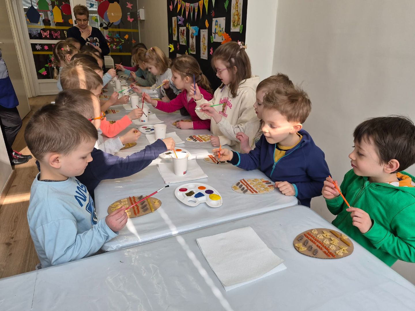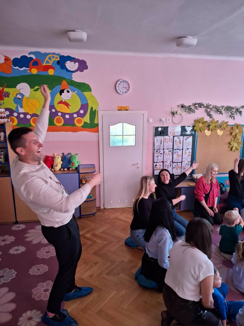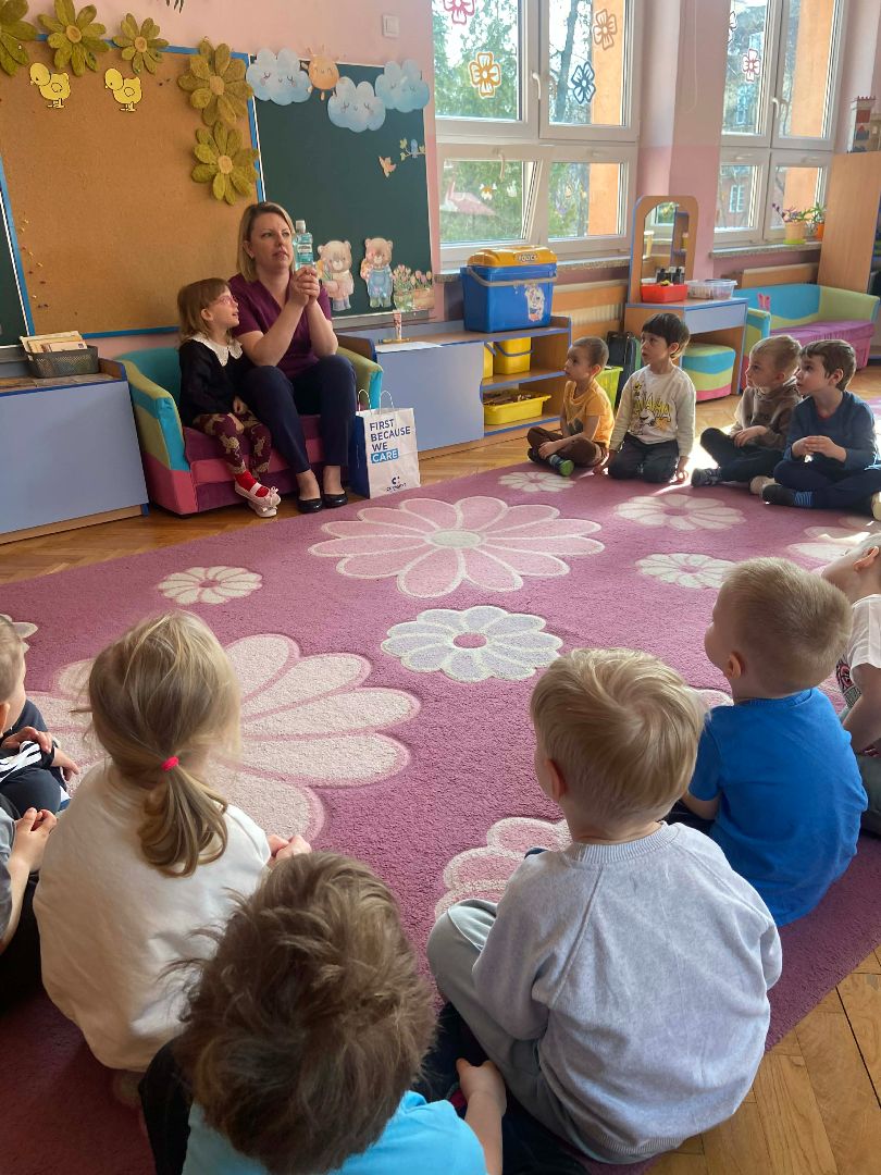 W grupie Myszek odbyło się wyjątkowe spotkanie – odwiedziła nas mama Magdy, która jest stomatologiem. Była to doskonała okazja, aby w ciekawy i przystępny sposób przybliżyć dzieciom temat dbania o zdrowie jamy ustnej. Podczas wizyty dzieci dowiedziały się, jak prawidłowo dbać o zęby, jak często należy to robić, co się dzieje w gabinecie stomatologicznym oraz dlaczego regularne wizyty u dentysty są tak ważne. Nie zabrakło także praktycznych wskazówek dotyczących zdrowego odżywiania i jego wpływu na zęby. Dzieci z dużym zainteresowaniem słuchały, zadawały pytania i chętnie dzieliły się swoimi doświadczeniami.