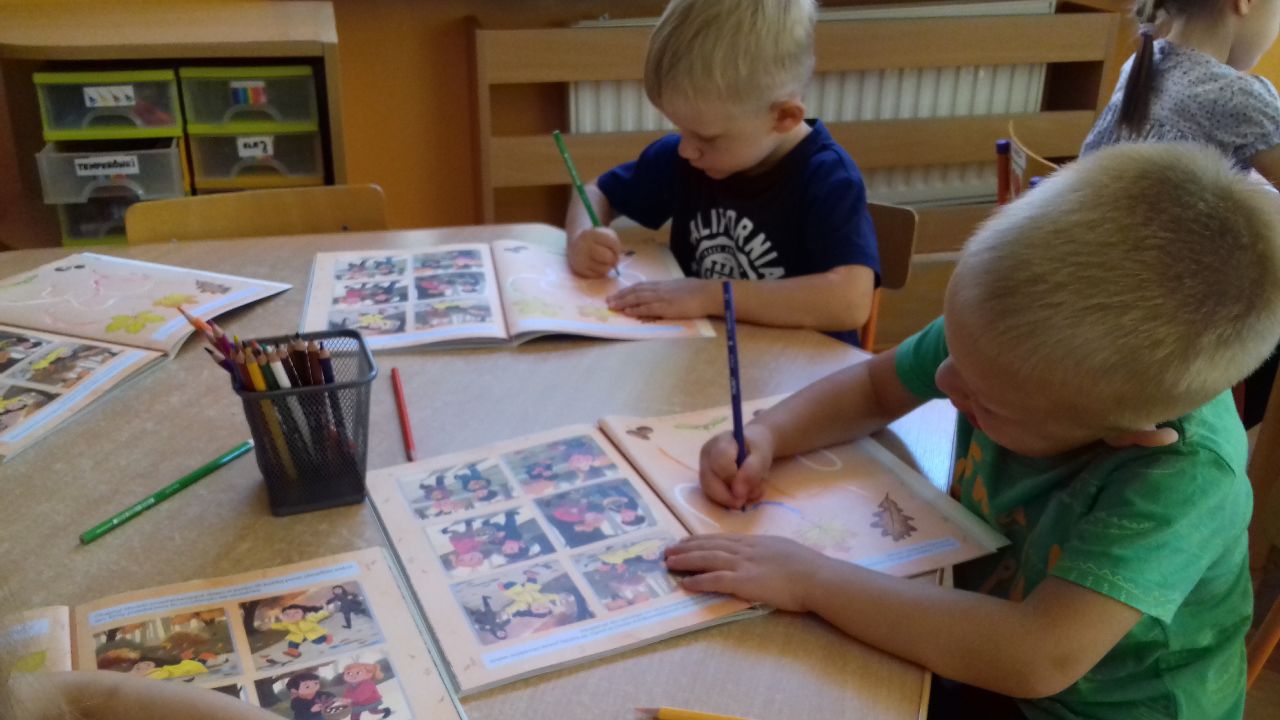 Jesień to kolorowa i wyjątkowa pora roku. W tym roku bardzo słoneczna i ciepła, z czego cieszą się nie tylko dorośli, ale przede wszystkim dzieci - prawdziwa „Polska Złota Jesień”. Nasze przedszkolaki z zapałem i ciekawością poznają jesień w lesie - wirtualnie ale co znaczy technika :-))). Po raz pierwszy też wykonały pracę w swoich nowych książeczkach. Za to dary jesieni w postaci kolorowych liści, żołędzi i kasztanów szukały już same w przedszkolnym ogrodzie. A gdy już nacieszyły się „noskami” zabawom na podwórku nic nie dorówna... Trzeba korzystać póki piękna pogoda!