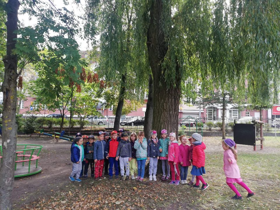 Korzystając ze słonecznej pogody dzieci z grupy VII wybrały się do pobliskiego parku aby zebrać eksponaty do kącika przyrody. Przedszkolaki zwróciły uwagę na jesienny koloryt drzew, wielozmysłowo poznając otaczającą przyrodę. Dzieci obserwowały drzewa i krzewy rosnące w parku, rozpoznawały i je i nazywały, dzieliły na liściaste i iglaste, zwracały uwagę na różnice w wyglądzie liści. Oczywiście nie obyło się od zbierania materiału przyrodniczego w postaci kasztanów, żołędzi i kolorowych liści. Miłym akcentem wyjścia do parku było wspólne odtańczenie „Jesiennego tańca” wspólnie ze spotkanymi uczniami XI liceum oraz grupą emerytów z Młodzieżowego Domu Kultury w Białymstoku.
