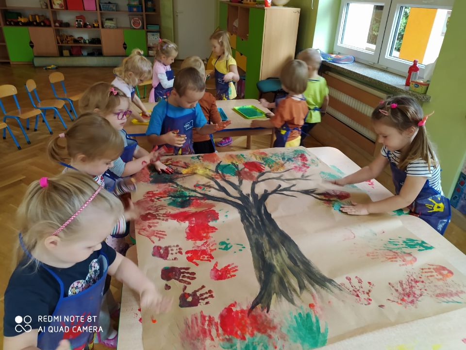 Kiedy za oknem jesień i drzewa zaczynają zmieniać swoje barwy,maluszki z grupy II zainspirowane jesiennymi zmianami w przyrodzie wykonały jesienne drzewka na dużych arkuszach papieru. W fartuszkach dzielnie przystąpiły do odbijania maczanych w farbie rączek. Nasze kolorowe jesienne drzewka ozdobiły salę a w takim anturażu fajnie jest tańczyć i bawić się w wiewióreczki czy jeżyki. Sami zobaczcie...:-)