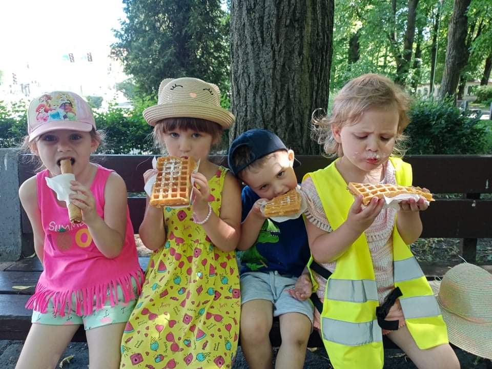 Kiedy rok szkolny dobiega końca i zbliżają się wakacje, a pogoda sprzyja to czas kiedy można „wrzucić na luz” i pozwolić sobie na odrobinę słodkiego szaleństwa. Najmłodsze przedszkolaki wybrały się do parku na gofry. Radość była ogromna! Dzieci z apetytem zjadły gofry z pudrem i rurki. Okruszkami, które nam zostały podzieliliśmy się z kaczkami. Miło było zobaczyć mamę kaczkę z młodymi kaczuszkami spacerującymi przy wodzie niedaleko Pałacu Branickich. Przedszkolaki bardzo lubią spacerować, znają już zasady i wiedzą jak zachować się w parku czy na przejściu dla pieszych. Dzisiejszy dzień był „przepyszny”.